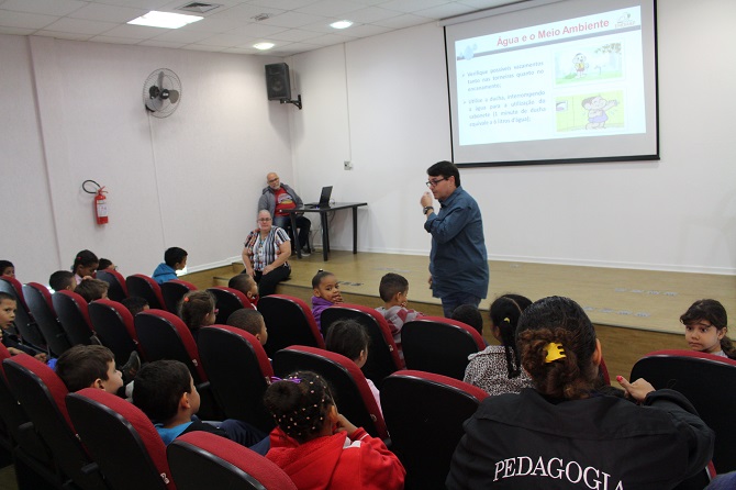 Para melhor aproveitamento da ação, a turminha de 60 crianças foi dividida em dois grupos de 30. Elas acompanharam uma palestra ministrada por Fábio Orsi, que usou a temática da Turma da Mônica para explicar a importância da preservação da natureza e da utilização dos recursos naturais sem desperdício.