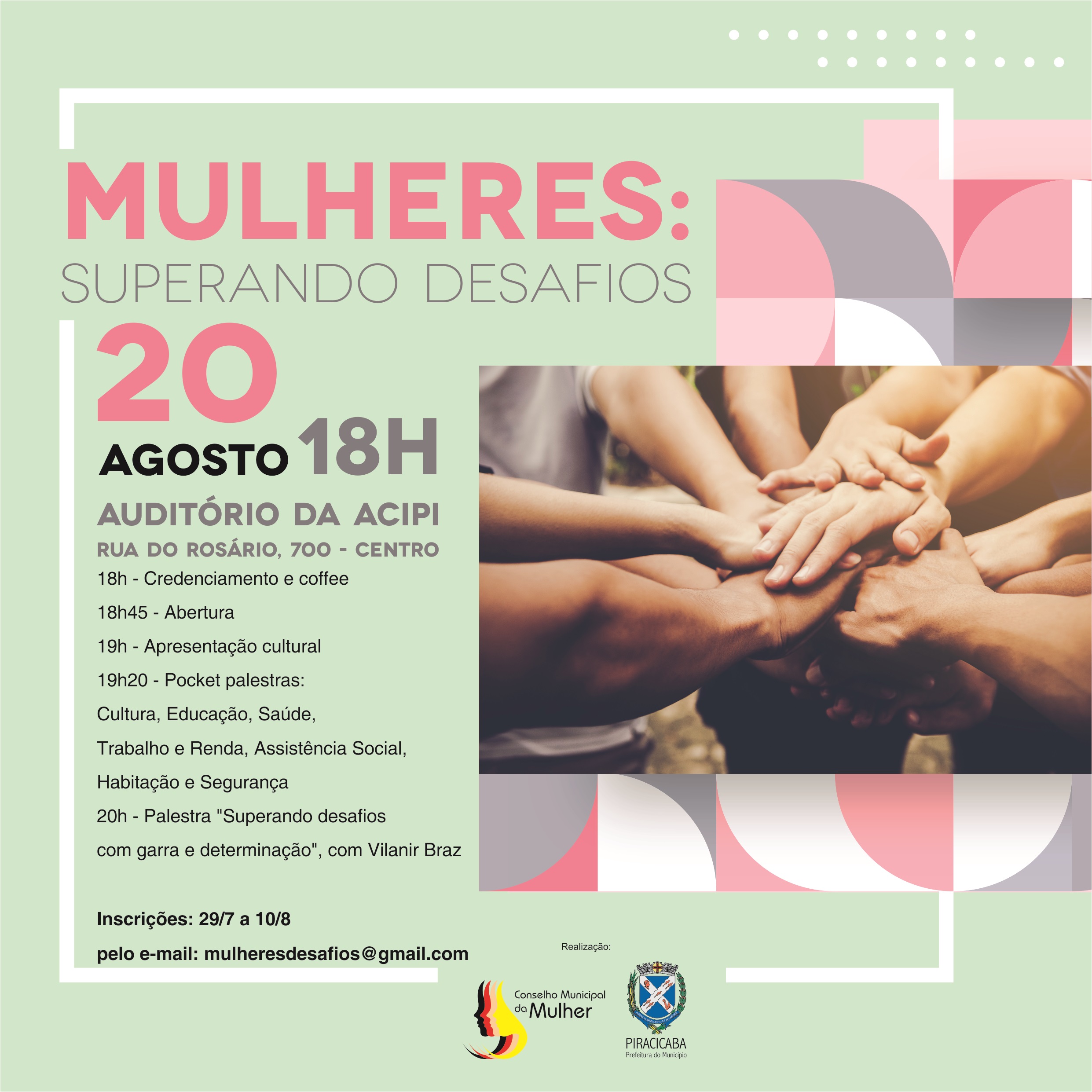 Visando a priorização de políticas públicas para mulheres, a Prefeitura de Piracicaba oferece inscrições de 29/7 a 10/8, para o encontro Mulheres: superando desafios. O evento que acontece no dia 20 de agosto, a partir das 18h, no auditório da Acipi – Associação Comercial e Industrial de Piracicaba, apresentará o fortalecimento institucional e a participação social por meio de programas e serviços gratuitos. As inscrições devem ser feitas via e-mail mulheresdesafios@gmail.com, com nome e endereço completos, além do número de telefone para contato.