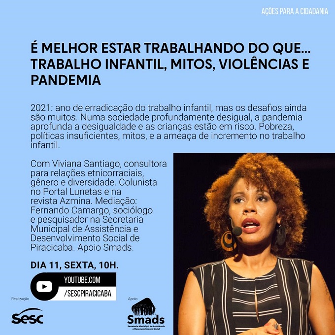 O evento, que terá como tema "É Melhor Estar Trabalhando do que… – Trabalho Infantil, Mitos, Violências e Pandemia", acontece na sexta-feira, 11/06, às 10h, e será transmitido ao vivo pelo Youtube do Sesc Piracicaba. A ação marca o Dia Mundial Contra o Trabalho Infantil (12/06).