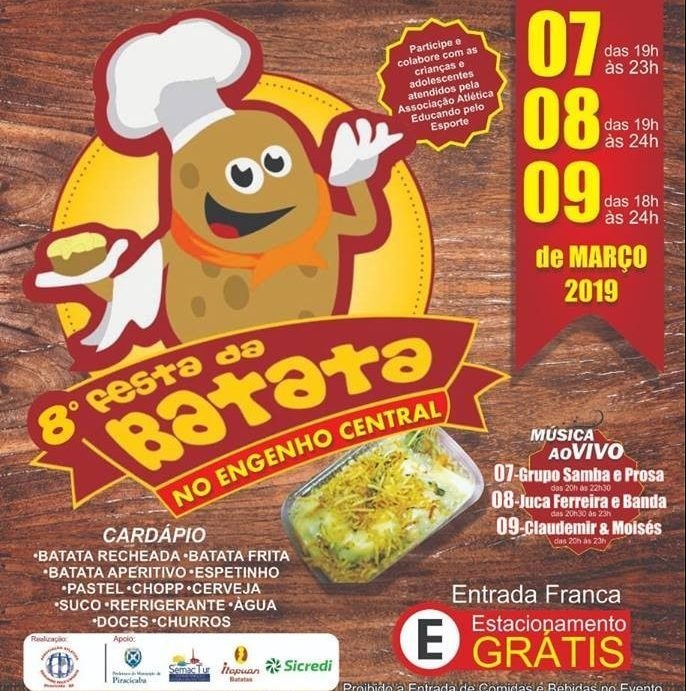 O Engenho Central recebe entre os dias 07 e 09/3, a 8ª Festa da Batata. O evento beneficente, organizado pela Associação Atlética Educando pelo Esporte (AAEPE) conta com atrações musicais e cardápio variado. A festa tem início às 19h (quinta e sexta) e às 18h (sábado). A iniciativa tem o apoio da Prefeitura Municipal de Piracicaba, por meio da Secretaria da Ação Cultural e Turismo (SemacTur). A entrada e o estacionamento são gratuitos.