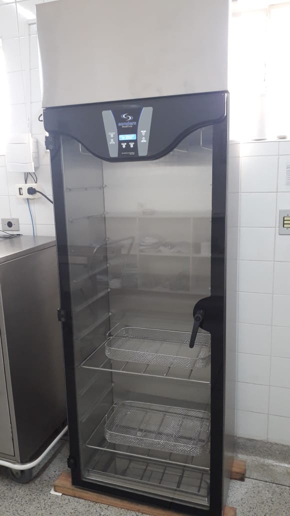 A Secretaria de Saúde adquiriu um gabinete de secagem para auxiliar no processo de desinfecção de instrumentos e assessórios médicos e hospitalares, usados no atendimento de pacientes com a Covid 19, tanto nas UPAs como na Atenção Básica. A máquina, já em operação na Central de Esterilização de Materiais, custou aproximadamente R$ 40 mil. A tecnologia trouxe mais agilidade na preparação de materiais de reuso, com toda a segurança necessária no enfrentamento da pandemia do novo coronavírus. De acordo com Alan Rodrigues Conceição, enfermeiro coordenador da Central de Esterilização, o serviço se tornou mais eficiente, proporcionando um ganho importante para toda a rede. “Antes, as traqueias, usadas na entubação dos pacientes, por exemplo, demoravam um dia para a desinfecção e secagem. Chegavam em um dia e eram entregues apenas no dia seguinte. Agora, são preparadas para reuso no mesmo dia, porque em 50 minutos já estão prontas e acondicionadas para o envio às unidades. O equipamento, solicitado durante a pandemia, é fabricado em aço inoxidável e tem capacidade para 400 litros. Seu método de secagem, por circulação forçada de ar quente, possui memória ajustável para três ciclos diferentes, com temperatura entre 30°C e 90°C, conforme a necessidade. “Trata-se de um ganho em escala, o que torna o serviço mais econômico e eficiente”, concluiu Alan.