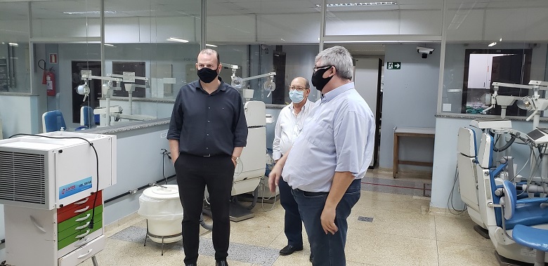 Diretor da FOP mostra salas que estão sendo adequadas devido a pandemia a Augusto Muzilli Jr e Filemon Silvano