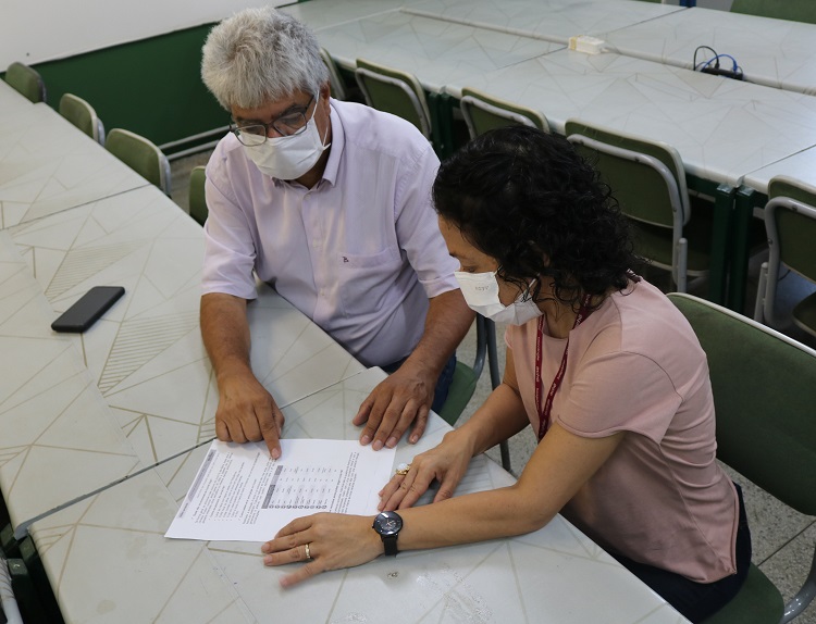 Negreiros mostra a Gislene material impresso produzido pela escola e que foi entregue aos alunos e servidores da unidade