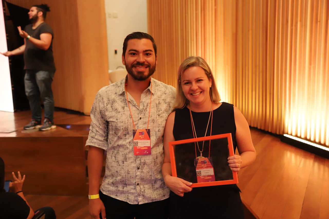 O diretor Bruno Oliveira e a professora Karina Ferraz, da E.M. Profª Antônia Benedita Eugênio, receberam o prêmio em cerimônia no Museu do Amanhã