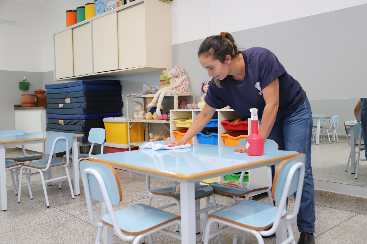 Salas e instalações das unidades escolares recebem uma atenção especial das equipes de limpeza.