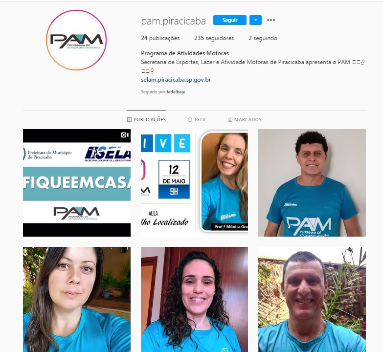 Diante da necessidade de adaptar às atividades diárias ao isolamento social, a Selam (Secretaria Municipal de Esportes, Lazer e Atividades Motoras), por meio do PAM (Programa de Atividades Motoras), criou na semana passada uma conta no Instagram – rede social online de compartilhamento de fotos e vídeos entre seus usuários, com o objetivo de levar atividades fisicas diárias aos seus alunos e ao público em geral durante a pandemia causada pelo novo coronavírus.