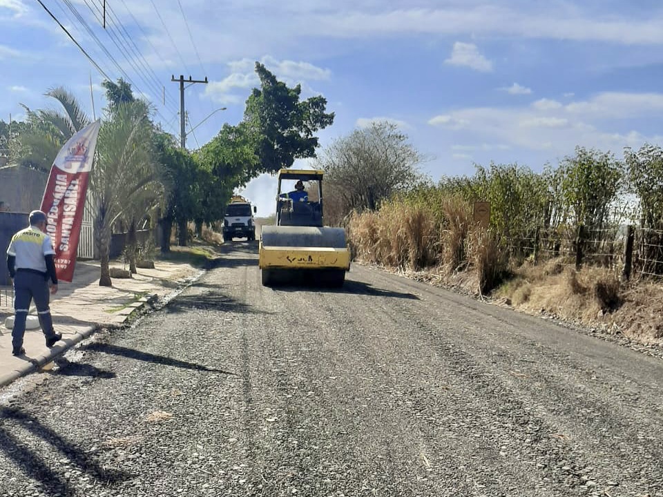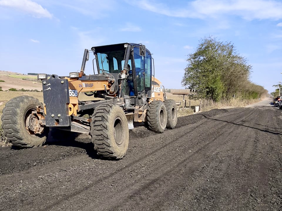 Máquina da Sema espalha o material na estrada do bairro Santa Isabel