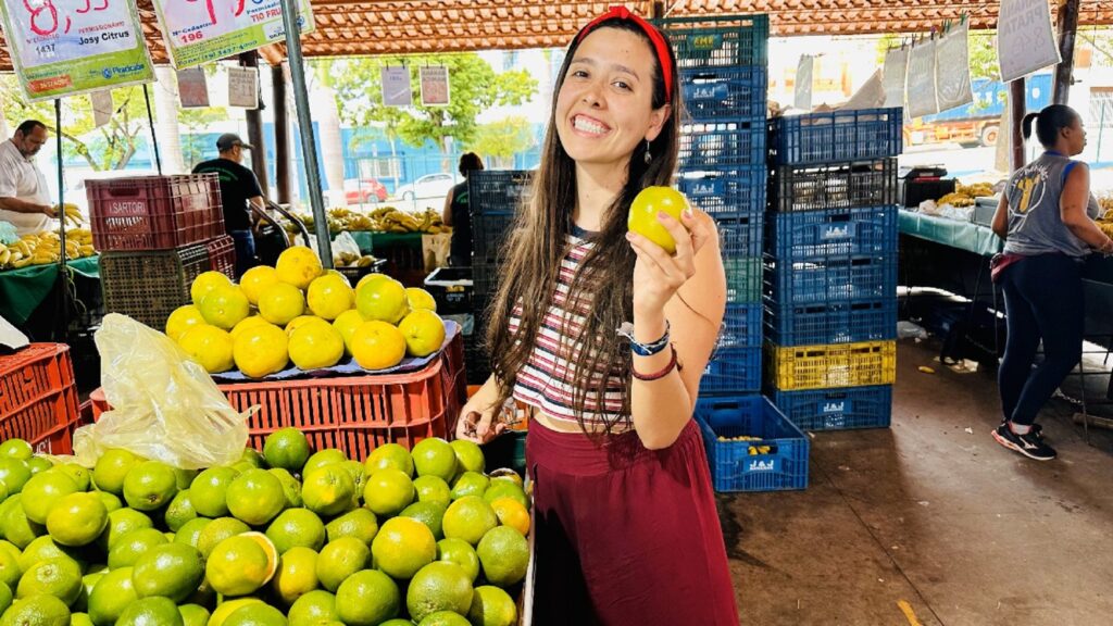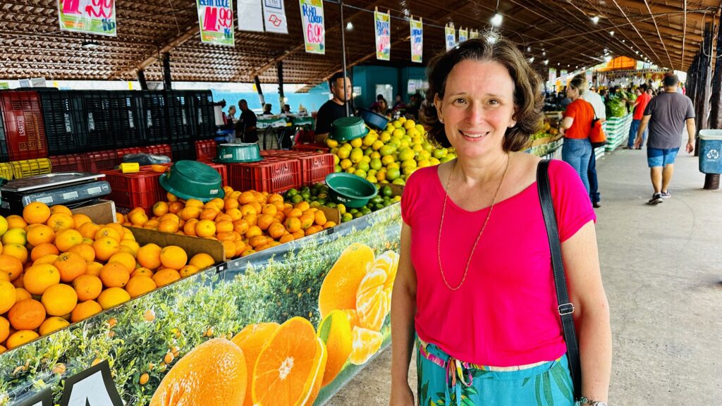 ELOGIO – Não escondendo a admiração de poder estar pela primeira vez no Brasil conhecendo um varejão municipal, Ana Maria Quiroga, 28 anos, colombiana, estudante do 3º ano na Universidade Laval, em Quebec, no Canadá, onde cursa doutorado em Biologia Vegetal, diz que é muito interessante o modo de comercialização que é feito no varejão, onde a qualidade e variedade de produtos são enormes e os preços são acessíveis. “Estou muito feliz em conhecer essa nova dinâmica de comercialização de produtos hortifrutigranjeiros. Considero uma política pública que merece ser adotada em outros países. Vou levar essa experiência para compartilhar o conhecimento com os demais colegas da Universidade em que eu faço doutorado”, ressaltou.