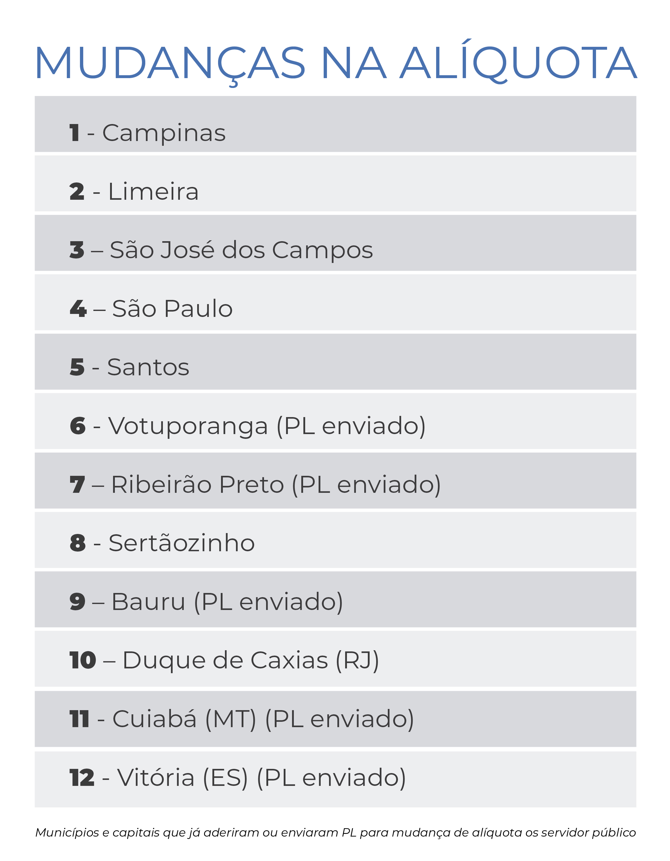 A Prefeitura encaminhou Projeto de Lei Complementar (PLC) para a Câmara que altera a alíquota de contribuição do servidor municipal do Ipasp (Instituto de Previdência e Assistência Social dos Funcionários Municipais de Piracicaba) até 31 de julho. Pela proposta, ela passa de 11% para 14%. Piracicaba tem, hoje, um total de 7.465 funcionários.