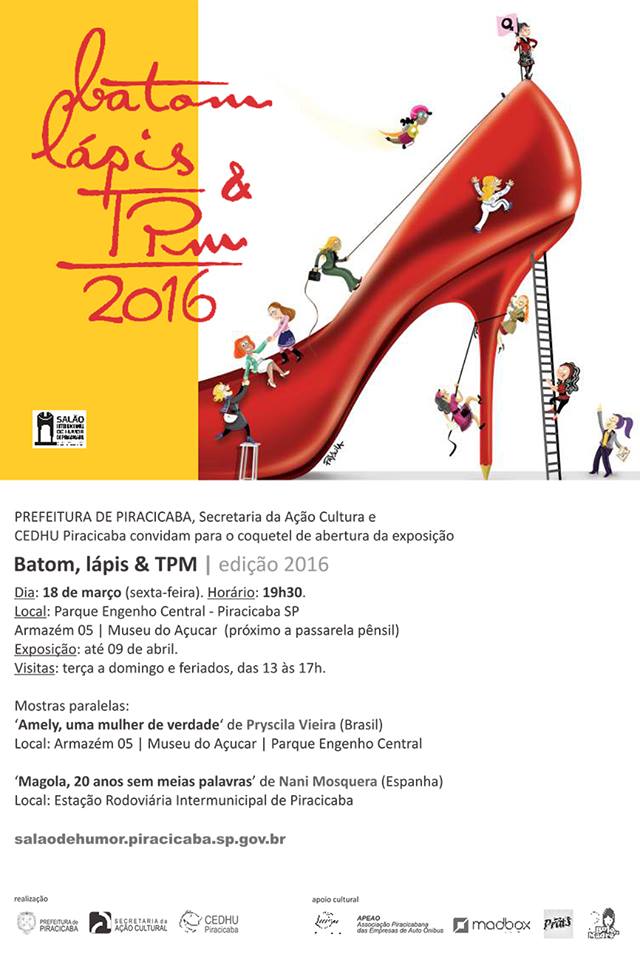 Uma exposição só delas. Assim é a Batom, Lápis & TPM, que chega este ano a sua sexta edição. Criada para homenagear as mulheres, a mostra será aberta nesta sexta-feira, dia 18, às 19h30, no Museu do Açúcar, Armazém 5 do Engenho Central. A realização é da Prefeitura de Piracicaba, por meio da Semac (Secretaria Municipal da Ação Cultural) e do CEDHU (Centro Nacional de Documentação, Pesquisa e Divulgação do Humor Gráfico de Piracicaba). A visitação da mostra, que integra a programação do 43º Salão Internacional de Humor de Piracicaba, pode ser feita até 9 de abril, de terça a domingo, e feriados, das 9h às 17h.