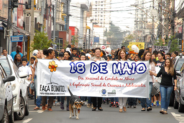 Piracicaba, 18 de maio de 2018 – Mais de 300 pessoas, munidas de apitos, flores, cartazes, muita convicção nas palavras de ordem e uma passeata repleta de crianças e adolescentes mostrando a importância de todos fazerem bonito no combate ao abuso e a exploração sexual de crianças e adolescentes.