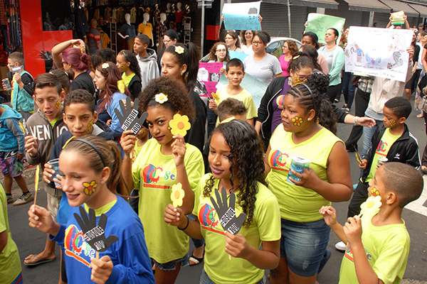 Durante a passeata – que foi acompanhada pela fanfarra da escola municipal José Antônio de Oliveira – e fez com que as pessoas parassem para ver o grupo passar, foram distribuídos folhetos sobre como denunciar e como reconhecer o abuso de crianças e adolescentes. Além dos folhetos, cartazes lembravam que criança não é brinquedo, que a sociedade que sabe do abuso e nada faz é cúmplice e que nós podemos ajudar a quebrar o silêncio de crianças e adolescentes que sofrem caladas e que o número para denunciar é o Disque 100. Durante o trajeto percorrido pela Rua Governador Pedro de Toledo, entre as ruas Dom Pedro II e a São José, as crianças também proferiram palavras de ordem como não, não, não, diga não à exploração e Não, não, Não, ao abuso sexual contra crianças e adolescentes dizemos NÃO!!!!