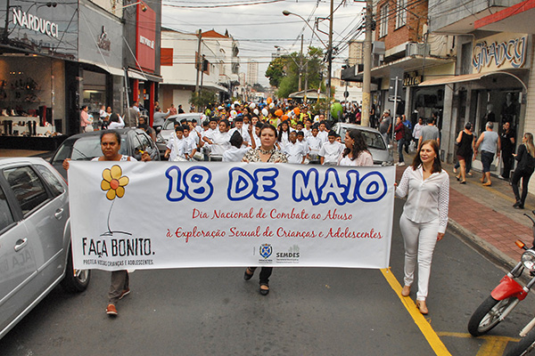 Durante a passeata – que foi acompanhada pela fanfarra da escola municipal José Antônio de Oliveira – e fez com que as pessoas parassem para ver o grupo passar, foram distribuídos folhetos sobre como denunciar e como reconhecer o abuso de crianças e adolescentes. Além dos folhetos, cartazes lembravam que criança não é brinquedo, que a sociedade que sabe do abuso e nada faz é cúmplice e que nós podemos ajudar a quebrar o silêncio de crianças e adolescentes que sofrem caladas e que o número para denunciar é o Disque 100. Durante o trajeto percorrido pela Rua Governador Pedro de Toledo, entre as ruas Dom Pedro II e a São José, as crianças também proferiram palavras de ordem como não, não, não, diga não à exploração e Não, não, Não, ao abuso sexual contra crianças e adolescentes dizemos NÃO!!!!