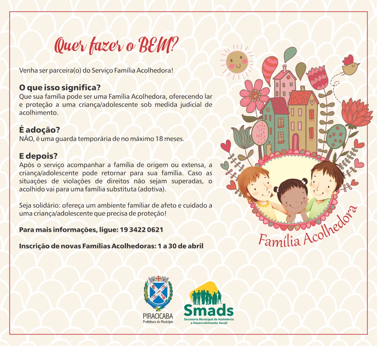 Piracicaba, 23 de abril de 2019 – O Serviço de Acolhimento em Família Acolhedora prossegue com inscrições abertas para novas famílias para compor o quadro de parceiros. As inscrições acontecem até 30 de abril e devem ser feitas na própria sede do serviço.