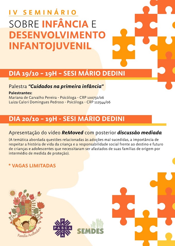 Acontece nesta quinta-feira (19) e sexta-feira (20), a IV edição do Seminário sobre infância e desenvolvimento infanto juvenil. O Seminário será realizado no Sesi Piracicaba, a partir das 19h. A organização do evento é da Família Acolhedora, serviço de Acolhimento Familiar a crianças e adolescentes que necessitem ser afastados de sua família de origem em decorrência de medida de proteção por determinação judicial, realizado pela Secretaria Municipal de Desenvolvimento Social (Semdes) em parceria com a Pastoral do Serviço da Caridade de Piracicaba (Pasca).