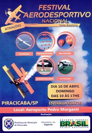 A Prefeitura de Piracicaba, por meio da Secretaria de Turismo, anuncia que no dia 10 de abril realizará um “Festival Aerodesportivo Nacional”, através da celebração de um convênio com o Governo Federal, por meio do Ministério do Esporte. A primeira edição deste evento foi realizada na cidade de Piracicaba nos meses de março e abril de 2012, também em parceria com o Ministério do Esporte, e esta será, novamente, uma grande oportunidade de levar à população de Piracicaba a noção de que esportes aéreos e radicais são práticas saudáveis e seguras quando desenvolvidas por profissionais habilitados.