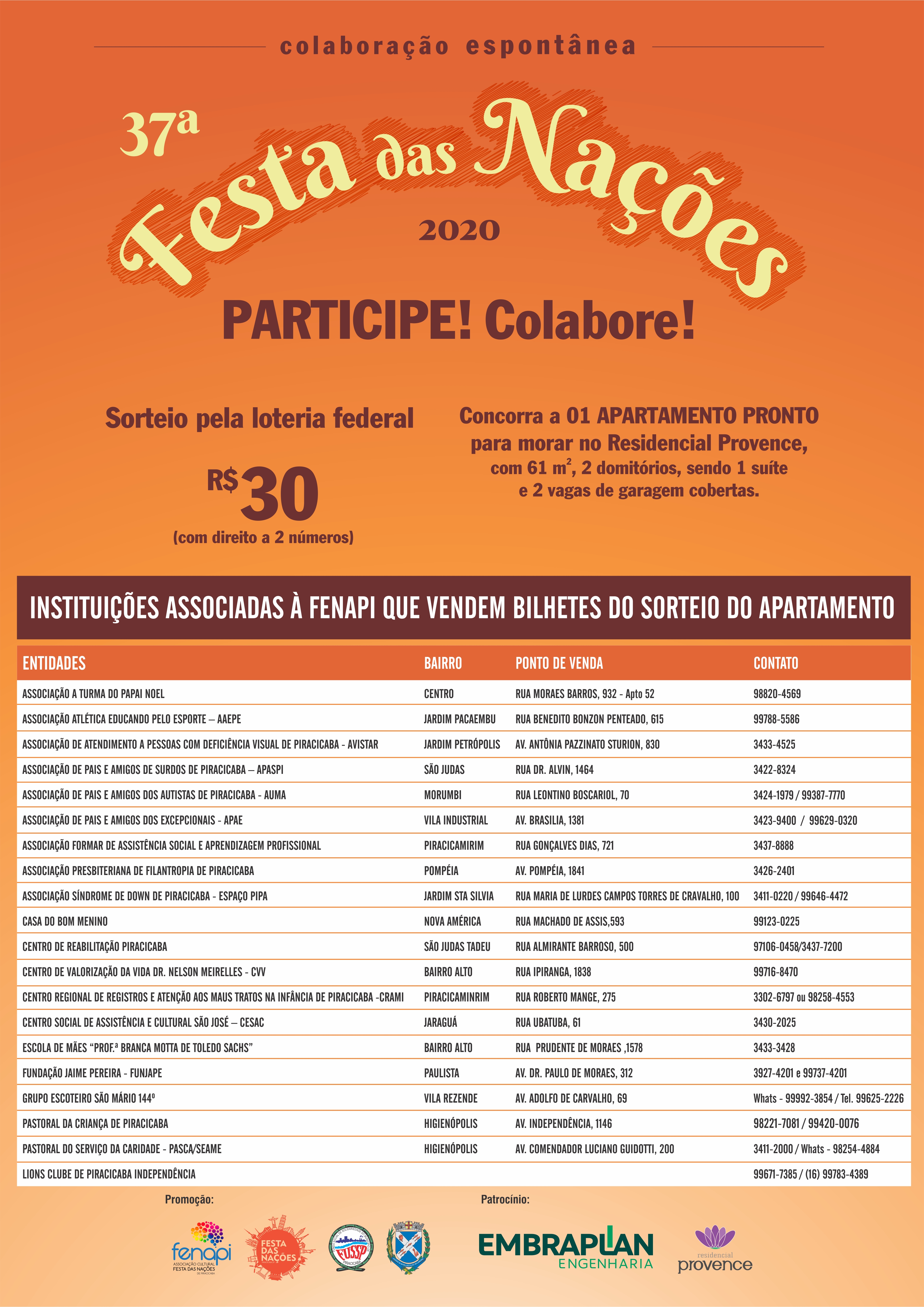 O sorteio do apartamento doado pela Embraplan à Fenapi (Associação Cultural Festa das Nações de Piracicaba), cuja renda será revertida para as instituições sociais associadas, seguirá cronograma da Caixa. Inicialmente, o sorteio pela Loteria Federal aconteceria no dia 26/12, mas o cronograma divulgado pela Caixa não prevê sorteio nesse dia e nem no sábado seguinte, 02/01/2021. Portanto, o primeiro sorteio no primeiro sábado do ano será o válido.