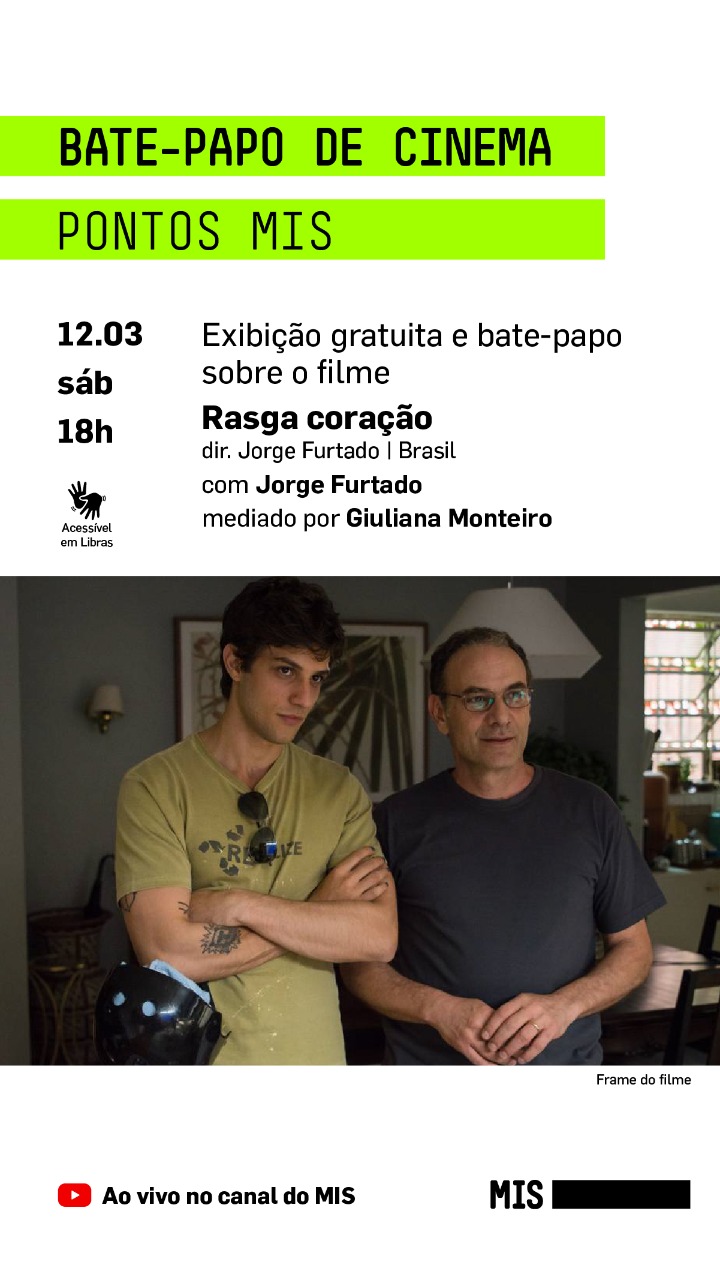 Acontece amanhã, 12/3, às 18h, mais uma edição do projeto Bate-papo de Cinema Pontos MIS (Museu da Imagem e do Som) com a exibição e bate-papo do filme Rasga Coração (2018/115min), de Jorge Furtado, pelo canal youtube.com/missaopaulo. A ação faz parte do Programa de Difusão Cultural do Museu da Imagem e do Som de São Paulo, em parceria com o Museu da Imagem e do Som de Piracicaba (MISP), mantido pela Secretaria Municipal da Ação Cultural (Semac).