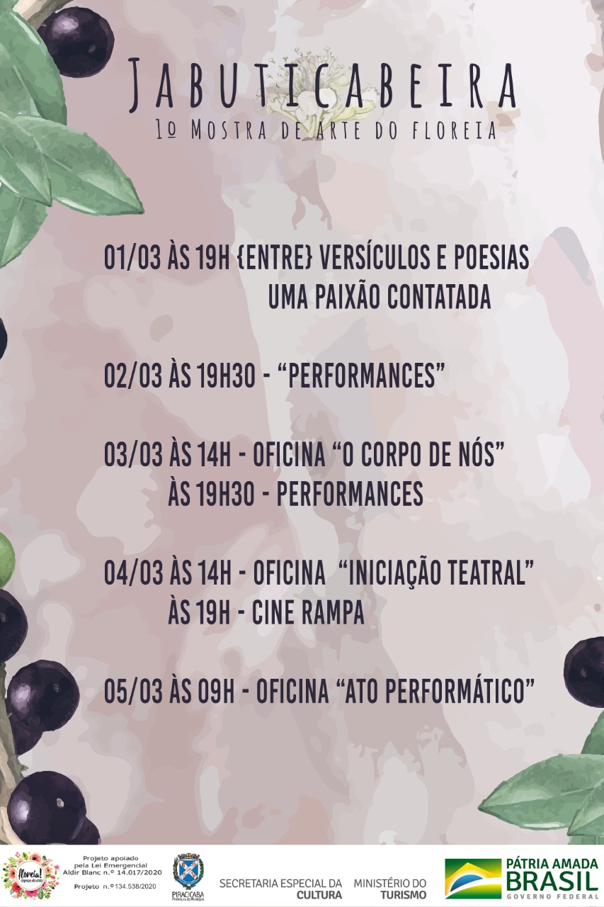 A Secretaria Municipal da Ação Cultural (Semac), por meio da Lei Aldir Blanc 14.017/2020, criada para destinar ações emergenciais ao setor cultural durante a pandemia da Covid-19, realiza a Jabuticabeira – 1ª Mostra de Arte do Floreia, no Floreia Espaço de Arte, entre os dias 1º e 05/03.
