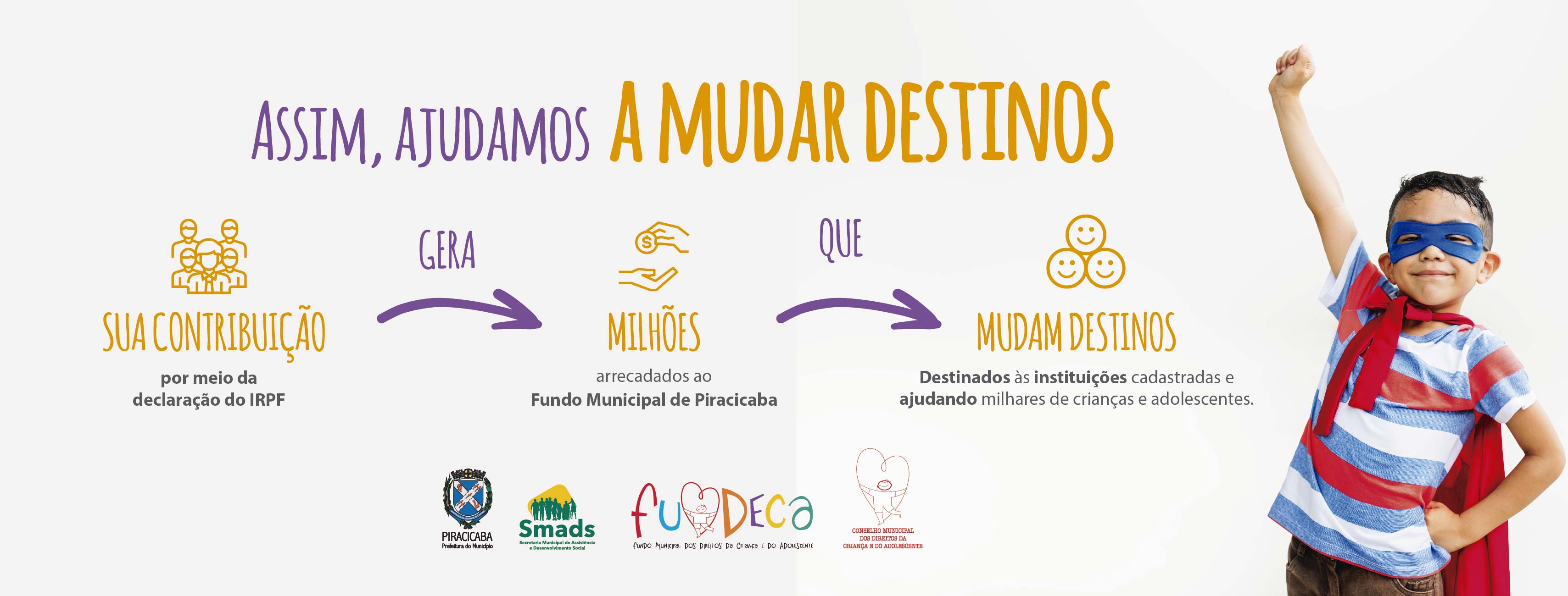 A Destinação para o Fumdeca garante que os recursos fiquem em Piracicaba e possam ser investidos em projetos aprovados pelo Conselho Municipal dos Direitos da Criança e do Adolescente (CMDCA) e que podem mudar o destino das pessoas, frisa Fabiane Fischer Gomes Oliveira, titular da Secretaria Municipal de Assistência e Desenvolvimento Social (Smads). “Doar para nossa cidade e ter a oportunidade de ver o que é feito com este dinheiro é o que todos querem, não é mesmo. Então, doe e acompanhe os projetos sociais da nossa Piracicaba.”