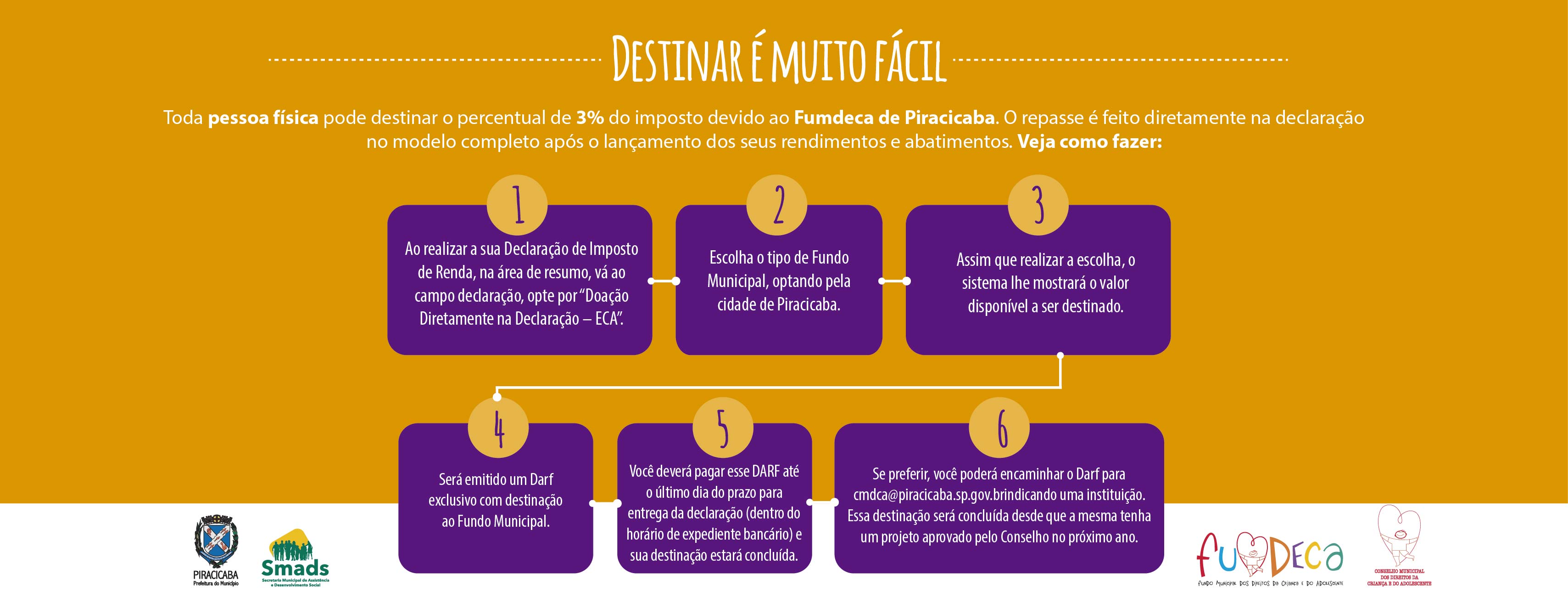 Para destinar até 3% do valor devido ao Fumdeca, a pessoa física deve optar pelo modelo completo de declaração de imposto de renda. O material informativo do Fumdeca tem um passo-a-passo de como fazer. “Ao realizar a declaração, na área de resumo, vá ao campo declaração, opte por “Doação Diretamente na Declaração – ECA; escolha o tipo de Fundo Municipal, optando pela cidade de Piracicaba. Assim que realizar a escolha, o sistema mostrará o valor disponível a ser destinado e será emitido um Darf exclusivo com destinação ao Fundo Municipal. Este Darf deve ser pago até o final do horário de expediente bancário do dia 30 de junho. Feito o pagamento, a destinação será concluída.”