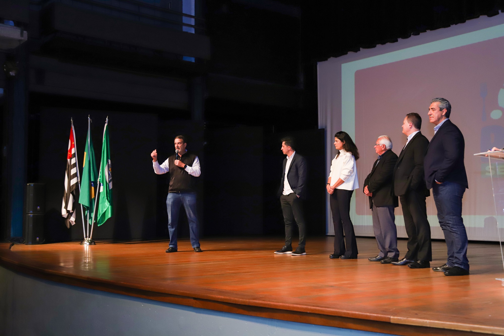 Parceiros do Pira Sem Fome discursaram sobre a relevância do projeto para Piracicaba. Estiveram presentes representantes da Unimed, Simespi, Hyundai e Acipi (Foto: Fabio Lisboa) A Prefeitura, por meio do Fundo Social de Solidariedade de Piracicaba (Fussp), realizou ontem, 09/08, o lançamento oficial do projeto Pira Sem Fome, que visa a arrecadação contínua de cestas básicas por meio de parceria com empresas do município. O evento aconteceu no Teatro do Engenho e contou com autoridades e representantes do setor privado de Piracicaba.
