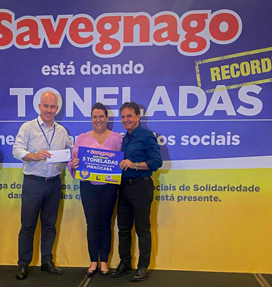A assesora de políticas públicas do Banco de Alimentos, Daniela Caroba, representou o Fussp, que recebeu 5 toneladas de alimentos O Fussp (Fundo Social de Solidariedade de Piracicaba) recebeu na última quinta-feira, 2/03, a doação de cinco toneladas de alimentos do Savegnago Supermercados, arrecadadas na campanha Save Mania, idealizada pela rede de supermercados, que beneficiou Fundos Sociais de 20 municípios nos quais a rede possui lojas. O evento de entrega aconteceu em Ribeirão Preto, sede da rede, e o Fussp foi representado pela assessora de políticas públicas do Banco de Alimentos do Fussp, Daniela Caroba.