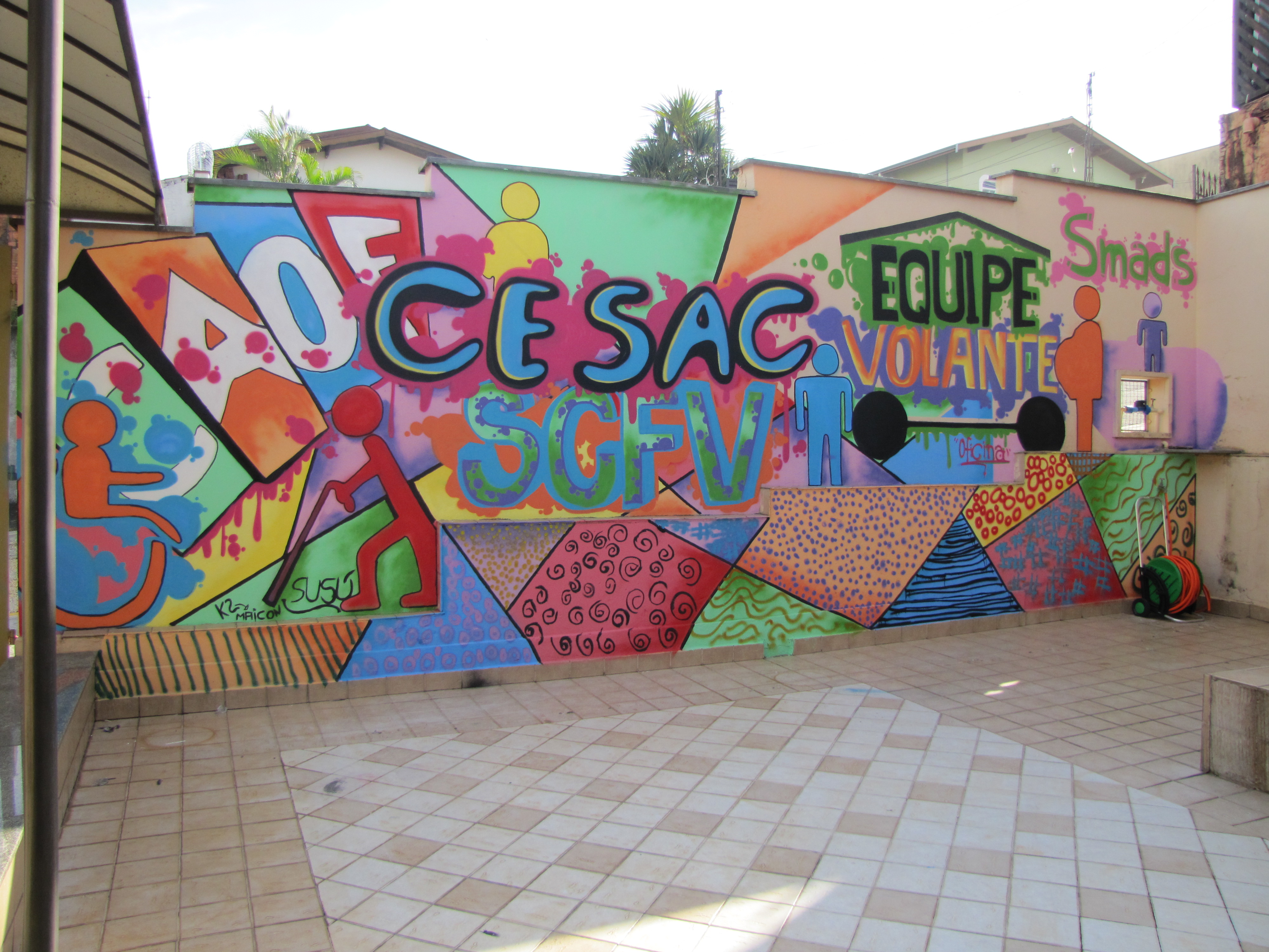 Painel grafitado mencionando os serviços ofertados em parceria entre a Smads e o Cesac. O grafite, feito em parede interna do Cesac pelo professor Ton e pelos alunos das oficinas de Grafite, que aconteceram de maio a julho em unidades de Cras