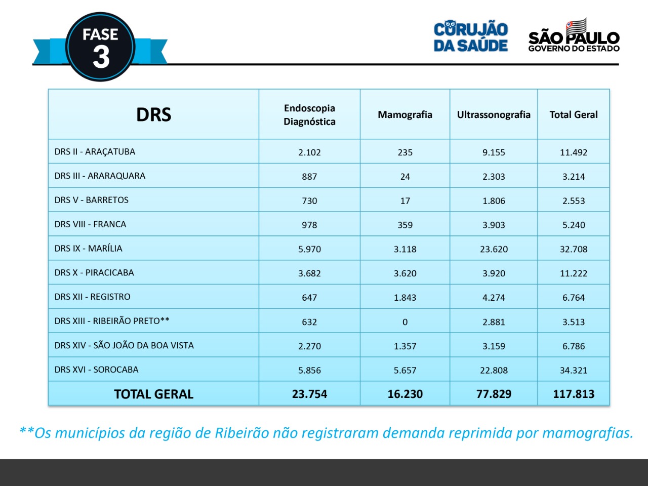 O Corujão disponibilizará um volume adicional de exames de endoscopia, mamografia e ultrassonografia que, segundo o edital do Estado, será suficiente para zerar a fila de espera para essas especialidades em toda a microrregião. Os exames poderão ser realizados por entidades governamentais (hospitais e AMEs – Ambulatórios Médicos de Especialidades) e da iniciativa privada, em horários alternativos, especialmente à noite, por isso o conceito 'Corujão', para não comprometer a dinâmicas do dia a dia das empresas envolvidas.