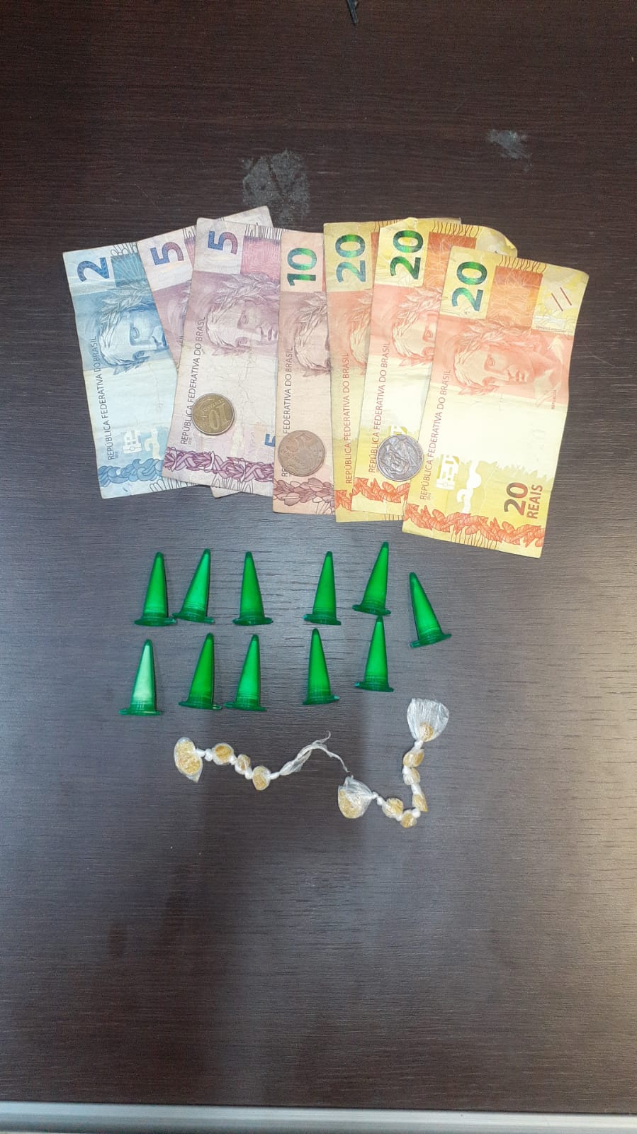 Ao notar a aproximação da viatura o indivíduo fugiu rapidamente do local, levantando suspeita. Além das drogas, foram encontrados em sua posse, R$ 82,20. Ele informou que estava traficando drogas por estar passando por necessidades financeiras.