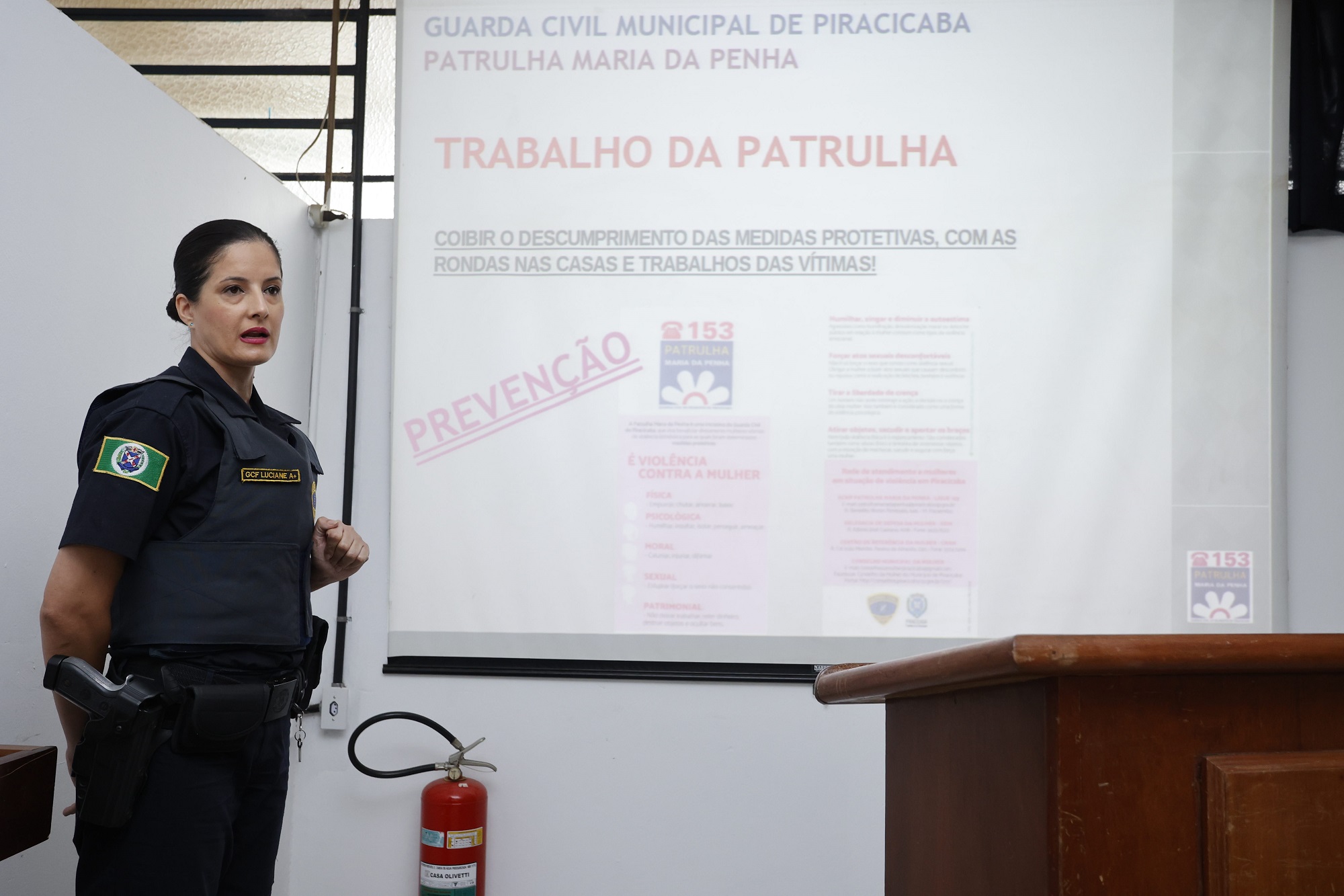 Após a fala do comandante, a encarregada do Patrulha Maria da Penha, Luciane Tovar, apresentou o trabalho da Patrulha, como ele é desenvolvido, seu alcance e ainda falou sobre o Botão S.O.S Mulher Piracicaba, lançado em fevereiro e ferramenta importante para um atendimento ágil para mulheres vítimas de violência doméstica diante de um risco real.