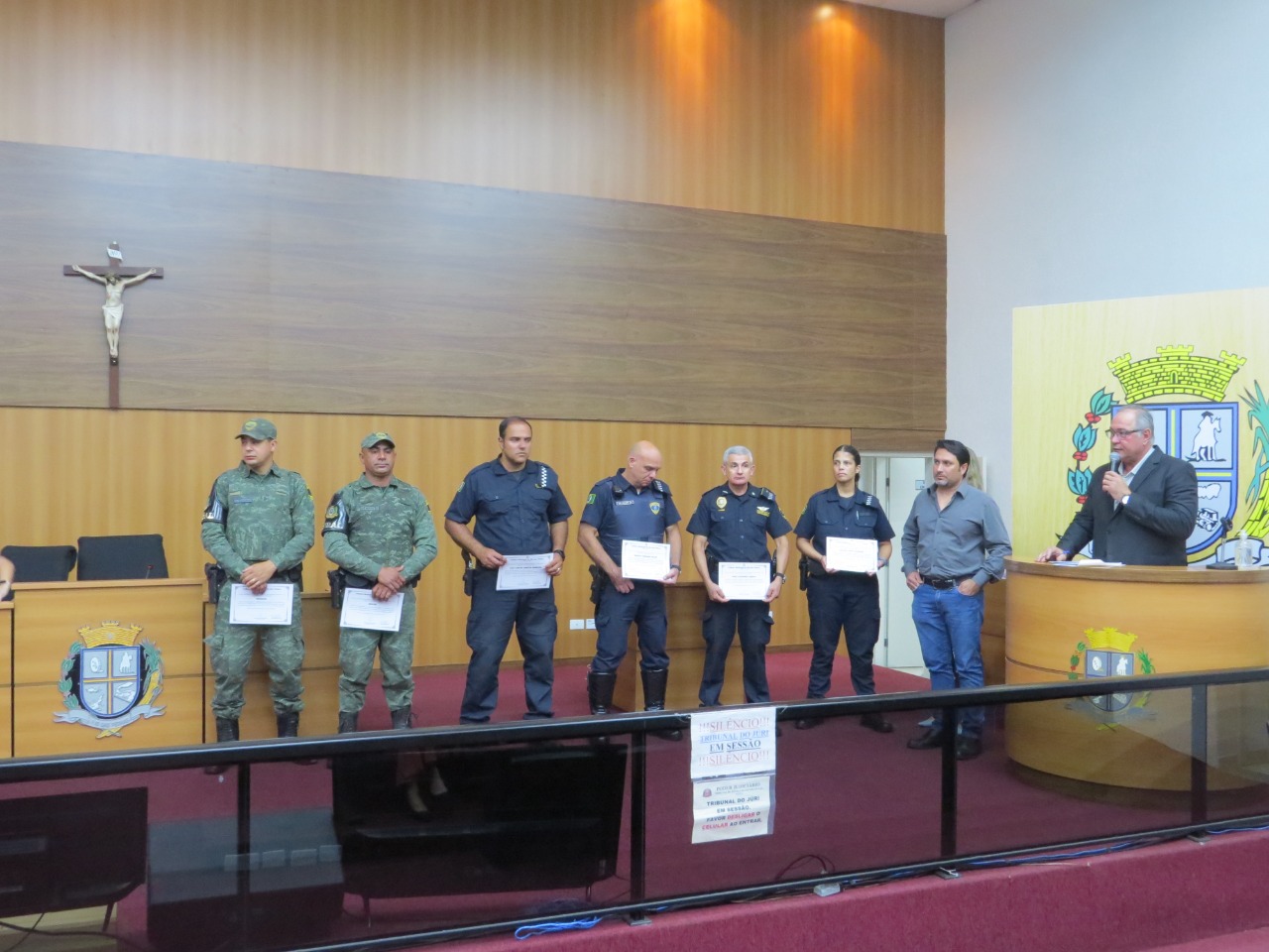 Os guardas-civis de Piracicaba envolvidos na ação que resultou na prisão de dois homens por roubo em joalheria na cidade de Rio das Pedras no dia 26/05 receberam moção de congratulações e aplausos ontem, quarta-feira, 19/10, da Câmara Municipal de Rio das Pedras. A solenidade foi realizada na Casa Legislativa do município vizinho e homenageou também os GCs da corporação de Rio das Pedras. A iniciativa foi do vereador Jeandre Deive Roncato.