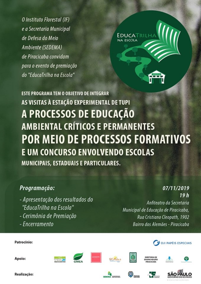 A edição 2019 do 'EducaTrilha na Escola' é realizada pelo Instituto Florestal e Secretaria Municipal de Defesa do Meio Ambiente de Piracicaba (Sedema), com o apoio da Secretaria Municipal de Educação, Diretoria de Ensino de Piracicaba, Fundação Florestal, Escola Superior de Agricultura Luiz de Queiroz – Esalq (Laboratório de Educação e Política Ambiental – OCA e Grupo de Estudos Desafios da Prática Educativa – GEDePE), Grupo Multidisciplinar de Educação Ambiental (GMEA) e OSCIP Pira 21. O patrocínio é da OJI Papéis.