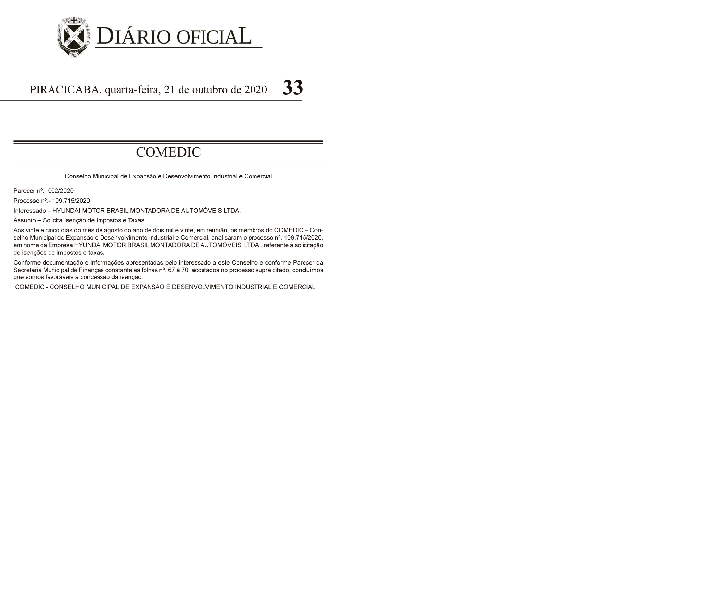 No último dia 21 de outubro, a Secretaria de Finanças publicou no Diário Oficial o deferimento do pedido da Hyundai. A Prefeitura, de acordo com a legislação municipal, garantiu a isenção de ISS (Imposto Sobre Serviços) na fase da construção civil e também no período da instalação das máquinas.