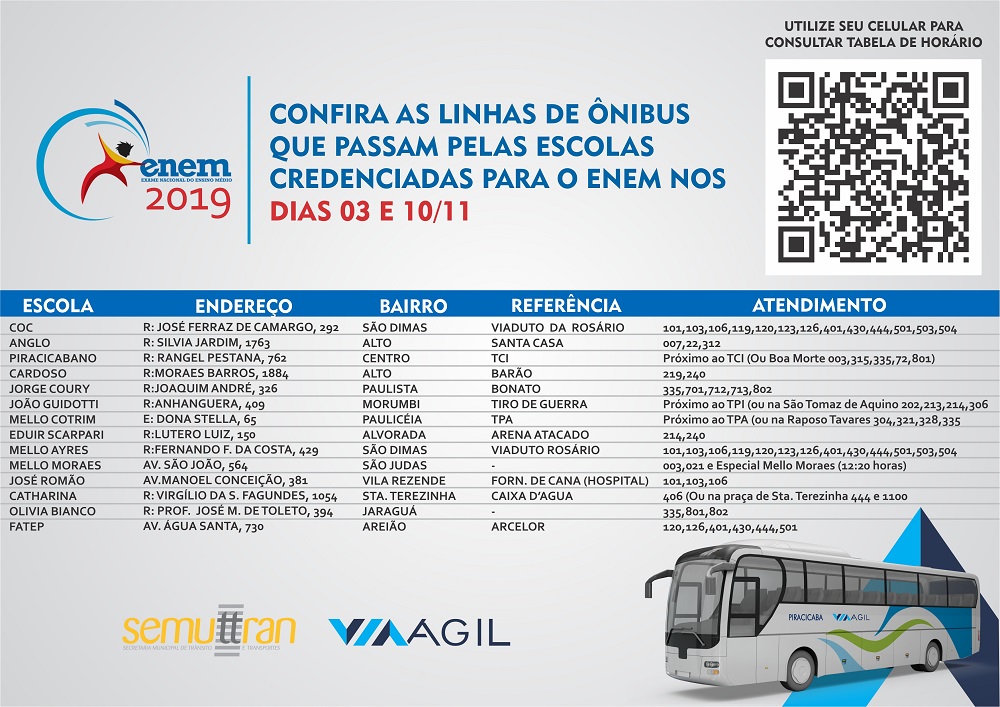 “A Prefeitura e a Via Ágil, preocupadas com o volume de pessoas que utilizarão o transporte público nesses dias de prova, decidiram soltar esse informativo para facilitar ainda mais a chegada das pessoas às escolas cadastradas, que já estão em endereços que têm um bom atendimento”, explicou Vanderlei Quartarolo, diretor do Departamento de Transportes Públicos de Piracicaba.