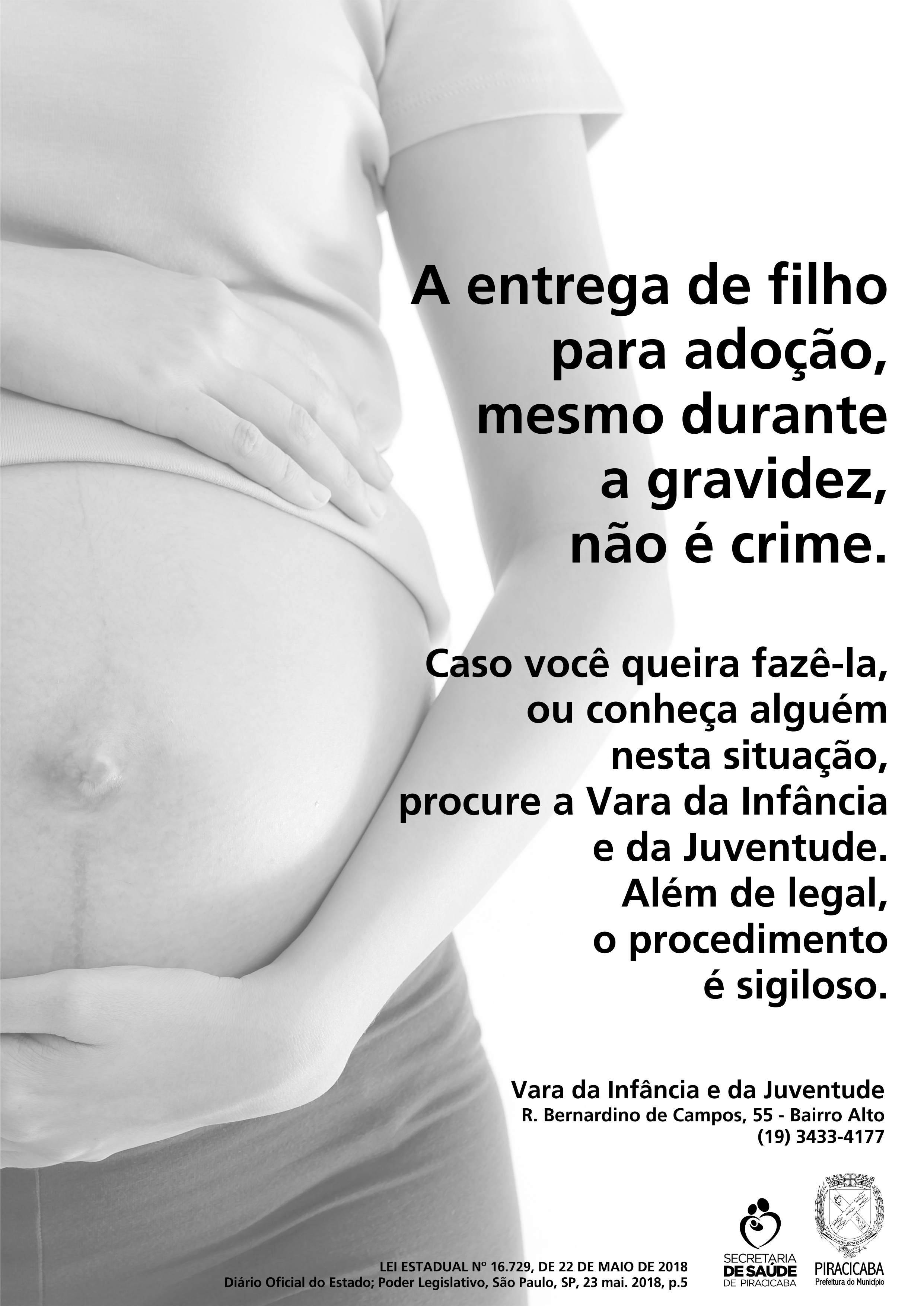Em cumprimento à Lei Estadual nº 16.729, a Secretaria de Saúde de Piracicaba está fixando em todas as unidades de saúde da rede municipal informativos, em locais de fácil visualização, contendo os seguintes dizeres: “A entrega de filho para adoção, mesmo durante a gravidez, não é crime. Caso você queira fazê-la, ou conheça alguém nesta situação, procure a Vara da Infância e da Juventude. Além de legal, o procedimento é sigiloso.”.