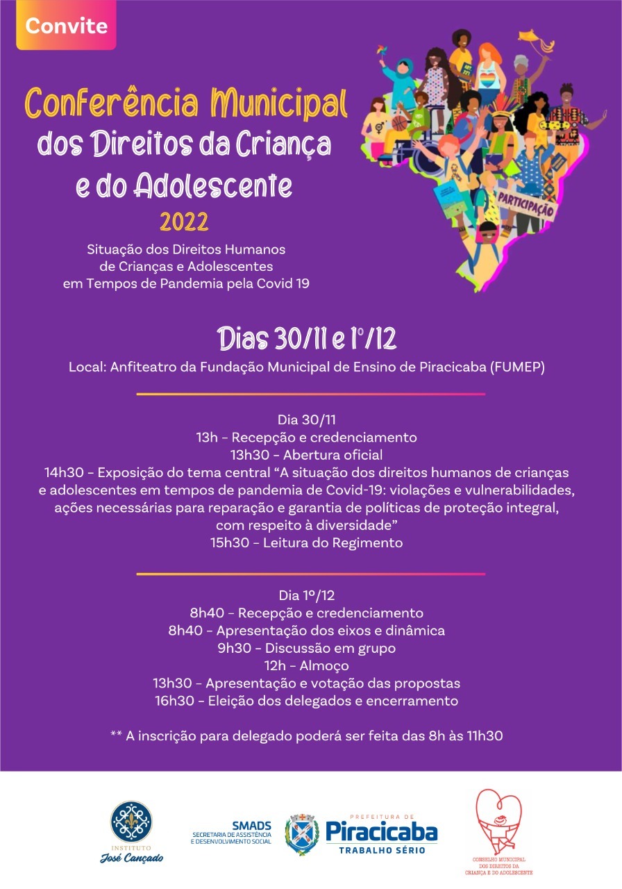 O Conselho Municipal dos Direitos da Criança e do Adolescente (CMDCA) está com inscrições abertas até o dia 27/11 para a 12ª Conferência Municipal dos Direitos da Criança e do Adolescente, que acontece nos dias 30/11 e 1º/12, no anfiteatro da Fundação Municipal de Ensino de Piracicaba (Fumep). Os interessados podem se inscrever pelo link https://forms.gle/dLtPYonhQYz8FVKLA, que também será disponibilizado conforme solicitação via e-mail cmdcafumdeca@piracicaba.sp.gov.br.