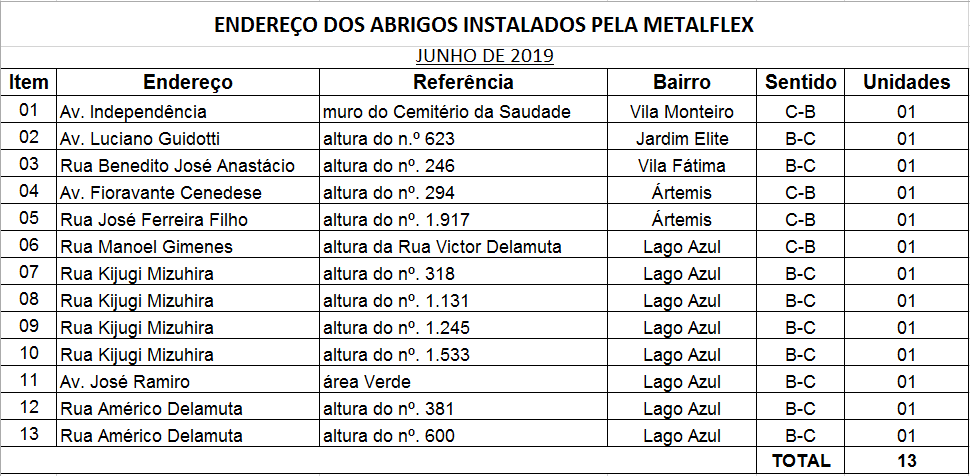 O Departamento de Transportes Públicos da Semuttran (Secretaria Municipal de Trânsito e Transportes) instalou mais 13 unidades novas de abrigos de ônibus no mês de junho/2019.