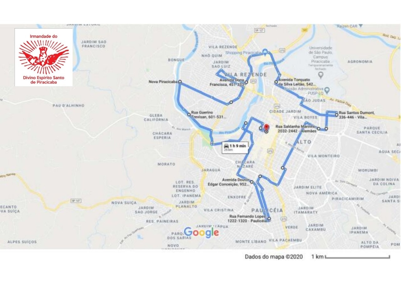 A Irmandade do Divino Espírito Santo de Piracicaba realiza neste domingo de Pentecostes, 31/5, a carreata religiosa Caminhos do Divino – envio das Bandeiras 2020. A concentração está marcada para às 9h, no Largo dos Pescadores (em frente à sede da Irmandade). Com início às 9h30, a carreata percorrerá o trajeto pedindo em oração, que o Espírito Santo abençoe a cidade e seus habitantes. Os participantes deverão usar máscaras e respeitar a distância segura entre os carros.
