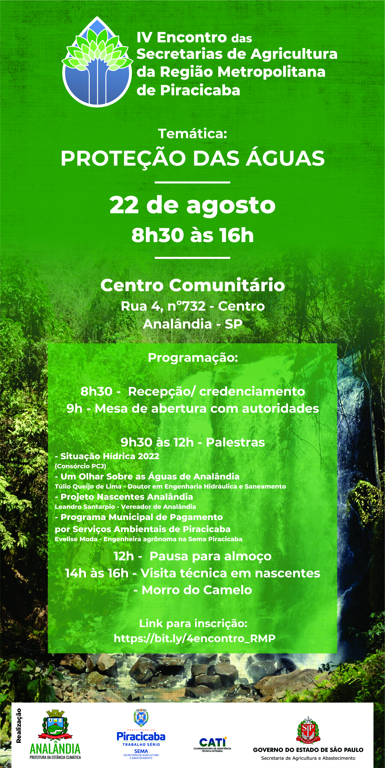 Acontece na próxima segunda-feira, 22/08, o IV Encontro das Secretarias de Agricultura da Região Metropolitana de Piracicaba (RMP), no município de Analândia, com o tema Proteção das Águas.