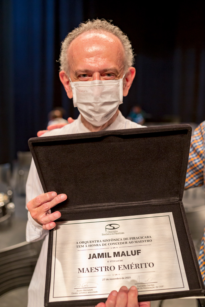 A OSP (Orquestra Sinfônica de Piracicaba) concedeu a Jamil Maluf o título de maestro emérito, durante o concerto realizado no último sábado (27), no Teatro Municipal Dr. Losso Netto. O piracicabano deixa de ser diretor artístico e regente titular, funções que serão anunciadas no próximo mês. Jamil Maluf recebeu o convite dos músicos piracicabanos André e Mayumi Micheletti para se tornar regente titular e diretor artístico da OSP em julho de 2014. "Apenas não estarei como responsável pela orquestra, mas já defini uma agenda de apresentações em 2022 e também participarei das discussões sobre o destino da OSP. É um cargo honorífico, o que para mim será muito bom, pois estou com uma atividade intensa demais", disse ele, que segue como regente da Orquestra Experimental de Repertório, em São Paulo, onde reside.