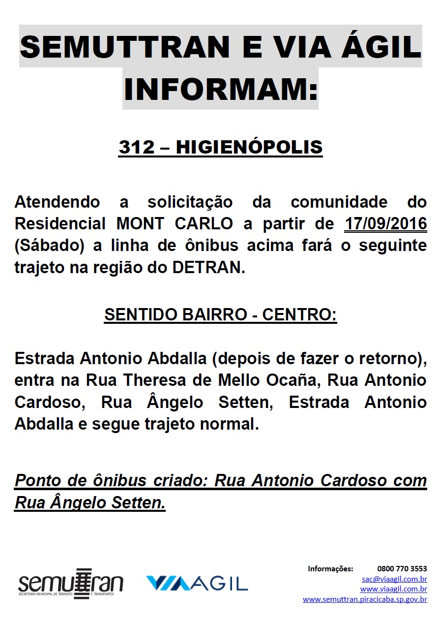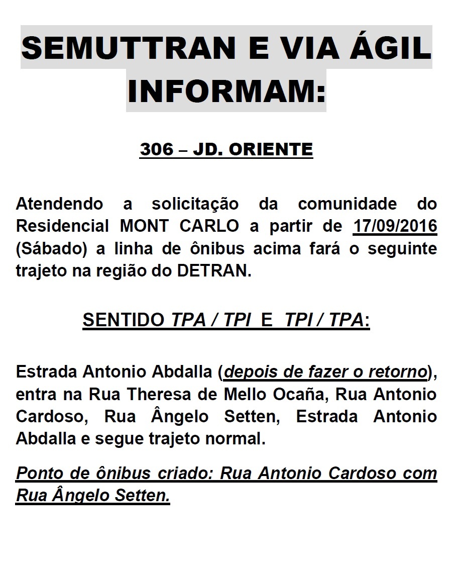 Jardim Mont Carlo será atendido pelas linhas 306 – Jardim Oriente-TPA/TPI e 312 – Higienópolis – TCI/TPA