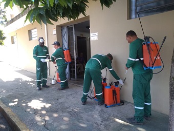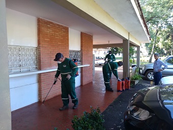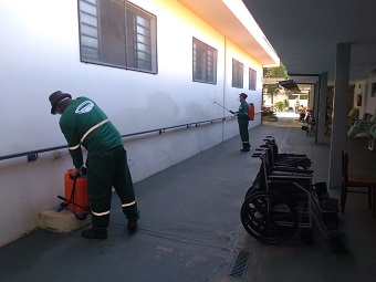 A equipe da Ambiental utilizou bombas de aspersão costais para pulverizar uma mistura de água e cloro nos arredores e em algumas áreas externas das duas casas que abrigam idosos.