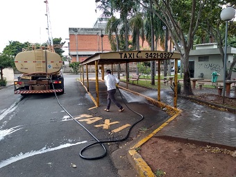 Hoje, o itinerário incluiu a praça Takaki, a praça Cláudio Sanches (na Paulista), a praça do Parafuso e praça da Paróquia Imaculada Conceição (ambas na Vila Rezende). No período da tarde, a desinfecção ocorreu nos velórios dos cemitérios da Saudade e da Vila Rezende e na praça da igreja dos Frades. A AÇÃO – O trabalho de desinfecção dos pontos de maior fluxo no município (considerados prioritários) foi iniciado no dia 29 de março, na praça José Bonifácio. Já percorreu unidades de saúde, hospitais, terminais de ônibus, praças e vias de grande circulação.