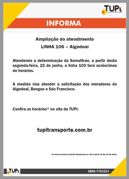 Linha 106-Algodoal terá acréscimo de horários