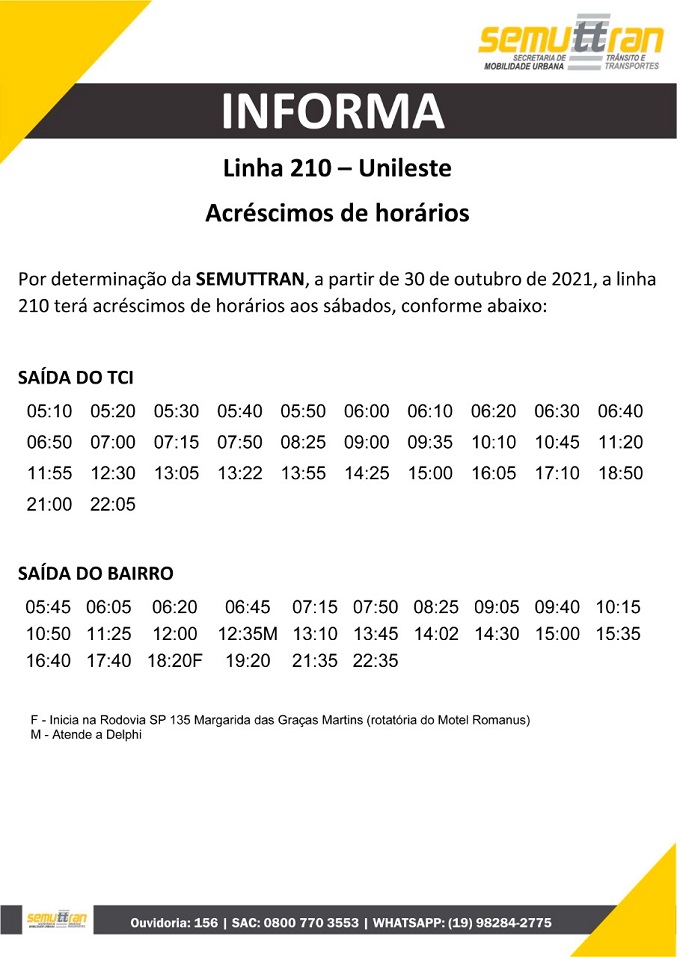 A partir de sábado, 30/10, a linha de ônibus 210-Unileste, com saída do Terminal Central e do bairro, terá os seus horários remodelados aos sábados, com acréscimo de viagens. Atualmente, esta linha contabiliza, aos sábados, 17 viagens de ida e 16 de volta. Com os acréscimos essa linha passará a realizar 32 viagens de ida e 26 de volta. A média mensal de passageiros que utilizam esta linha aos sábados foi de 36.070 passageiros em 2020 e 42.729 em 2021, até este mês.
