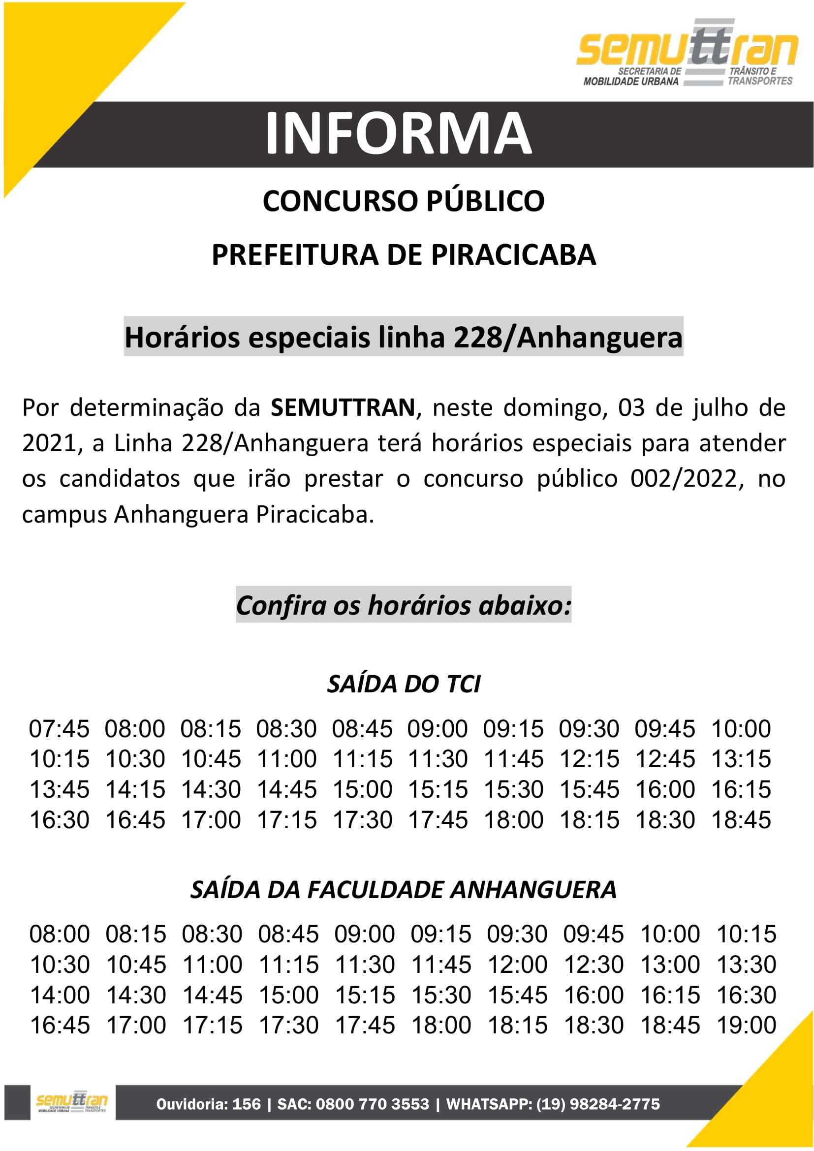 A Prefeitura de Piracicaba, por meio da Secretaria Municipal de Mobilidade Urbana, Trânsito e Transportes (Semuttran), vai oferecer no domingo, 03/07, horários especiais na linha 228 – Anhanguera para atender aos candidatos que vão prestar o concurso público 002/2022, da Secretaria Municipal da Educação, no campus Anhanguera Piracicaba.