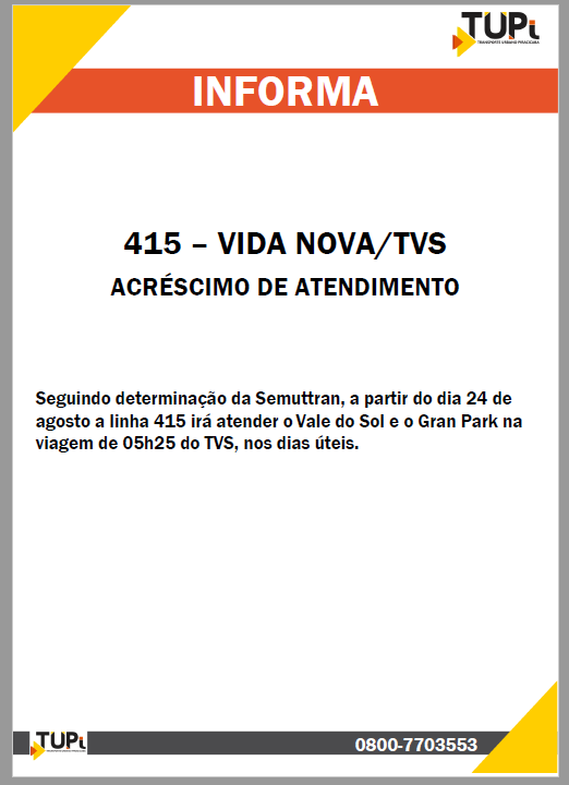 Linha 415-Vida Nova/TVS tem acréscimo de horário