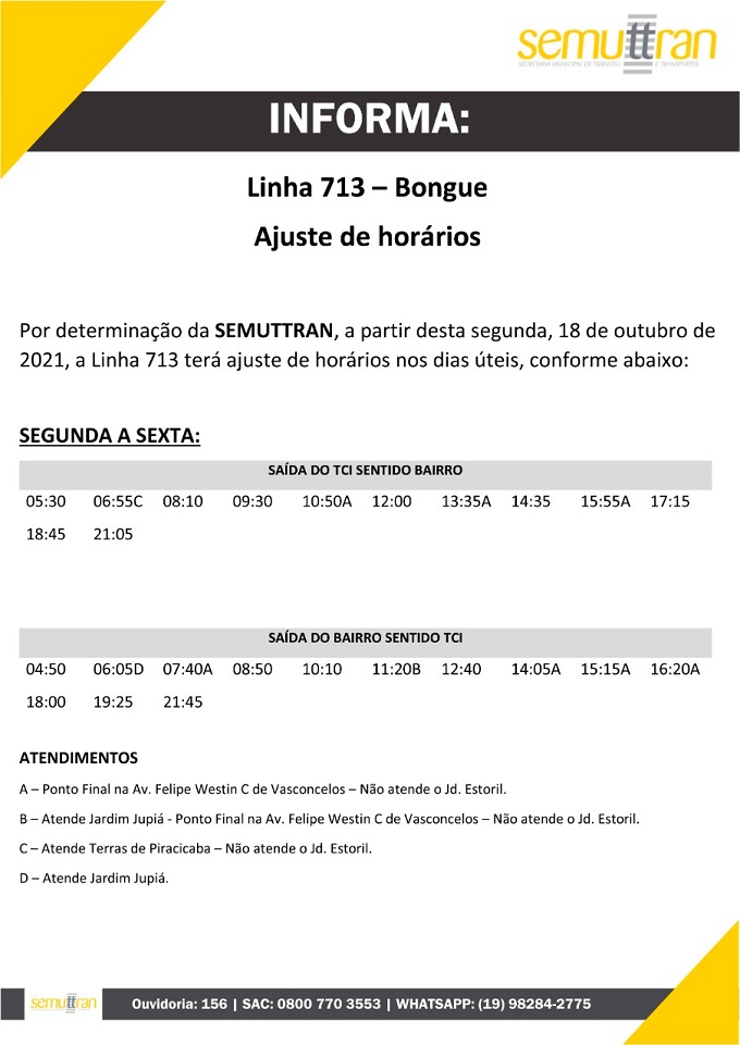 A partir de segunda-feira, 18/10, a Secretaria de Mobilidade Urbana, Trânsito e Transportes (Semuttran) fará ajustes de alguns horários de dias úteis na linha 713-Bongue, sentido Terminal Central de Integração (TCI)- bairro e bairro-TCI.