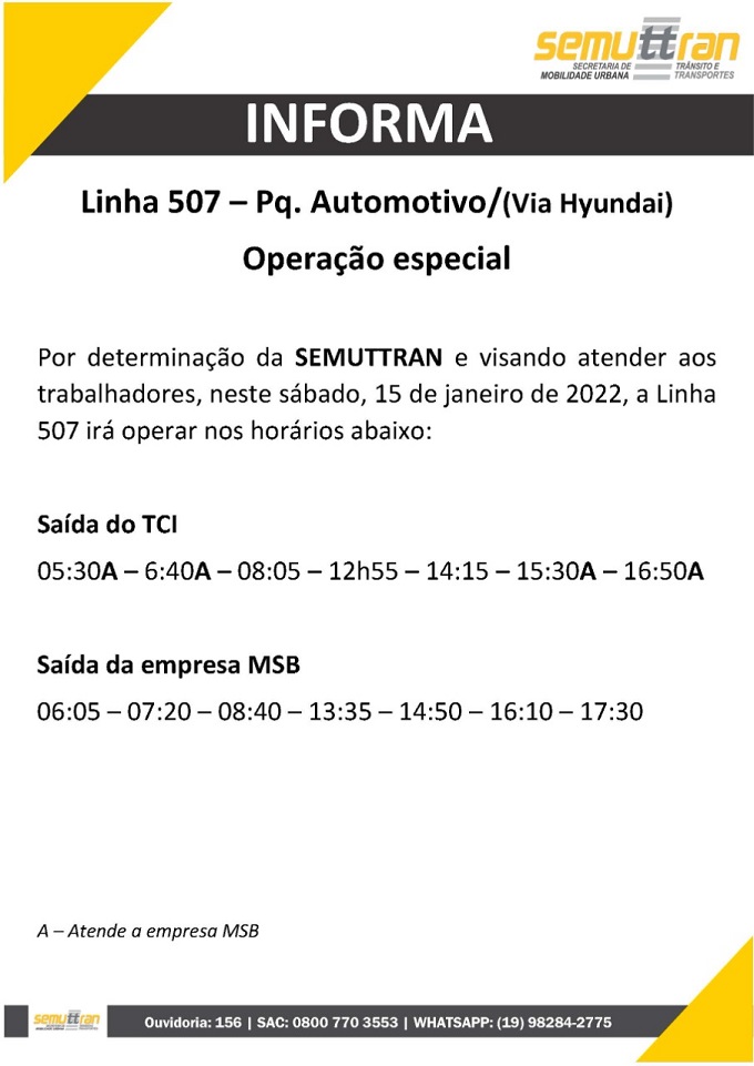 A Prefeitura por meio da Secretaria de Mobilidade Urbana, Trânsito e Transportes (Semuttran), disponibilizará, excepcionalmente, neste sábado, 15/01, horários especiais de ônibus na linha 507, Parque Automotivo (via Hyundai), com saída do Terminal Central de Integração (TCI) e da empresa MSB.